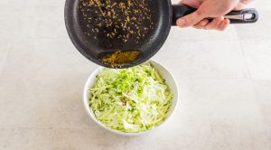 - 2 Esslöffel Gemüse in einen kleinen Topf geben Öl, verteilen Sie die Samen von Kreuzkümmel und erhitzen Sie bei mittlerer Hitze bis Die Samen beginnen nicht zu springen (ca. 3 Minuten). Öl kochen mit Zira mit Kohl-Gurken-Salat gießen und mischen.