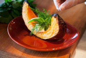 - Überbackener Kürbis mit Olivenöl, Kräutern, Pfeffer und Salz bei einer Temperatur von 180-200 Grad für ca. 45 Minuten.