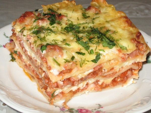 Ein einfaches Rezept und ein unglaublich leckeres Ergebnis! Eine Sauce wir bereite Häuser aus Hackfleisch zu, die zweite machen wir aus Quark. Kann auch fügen Sie traditionelle weiße Bechamelsoße hinzu.