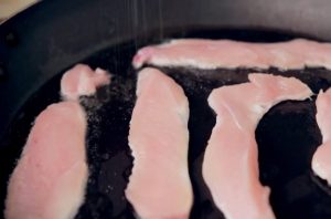 - Hähnchenbrust nehmen, in kleine Streifen schneiden. Dann in Pflanzenöl anbraten. Auf Wunsch kann die Brust gekocht werden.