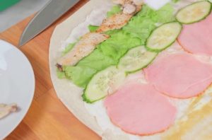 - Das Fladenbrot in eine Rolle wickeln und den Rand mit Frischkäse einfetten Konsolidierung.