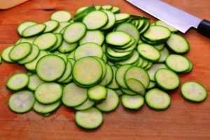 - Zucchini oder Zucchini in Würfel schneiden und in Oliven braten Öl bis weich.