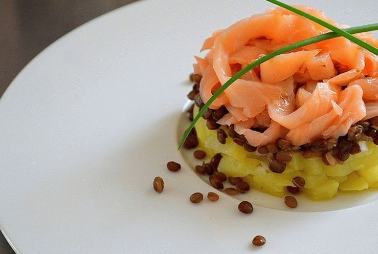 Wenn Sie keine Lust mehr auf normale und vertraute Salate haben und möchten Um Ihr Menü abwechslungsreicher zu gestalten, achten Sie auf dieses leckere luftgestoßener Lachssalat mit Linsen, der leicht zuzubereiten ist zu hause. Für Salat empfehle ich Ihnen, Kartoffeln in ihren Häuten im Voraus zu machen.