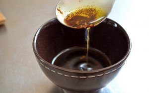 - Zum Dressing nehmen wir Sojasauce, Olivenöl, Senf und Weißweinessig. Wir mischen alles.