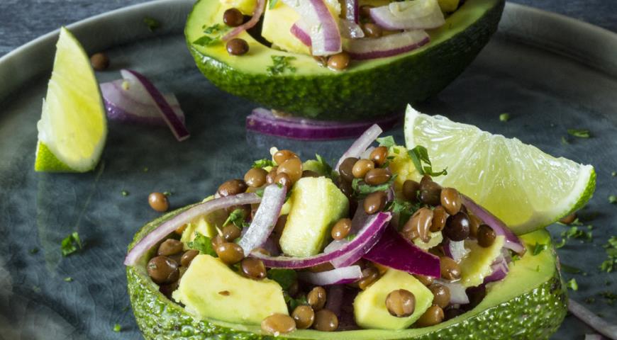 Köstlicher Linsensalat mit Avocado, Limette und Koriander koche einfach zu Hause. Einen interessanten und befriedigenden Salat rate ich Ihnen zu tun in Tassen Avocado.