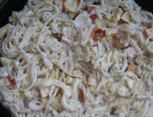 - Setzen Sie die Zwiebeln in einen Behälter und fügen Sie Essig, Mayonnaise und hinzu Gewürze.