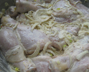 - Die Hähnchenschenkel in die Marinade legen und gehen lassen eine halbe Stunde einweichen.