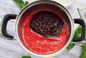 - Die Beeren in einem Topf verteilen und pürieren. Zucker hinzufügen. Bei schwacher Hitze zum Kochen bringen zwanzig Minuten.