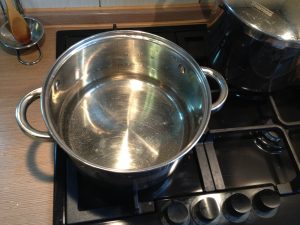 Zunächst müssen Sie eine köstliche Gemüsebrühe kochen. Dafür gieße 600 ml Wasser in die Pfanne und lege es auf das Feuer.