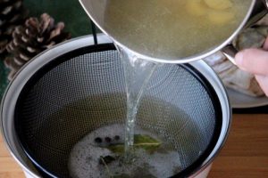 Die Flüssigkeit durch ein Sieb passieren und die richtige Menge hinzufügen Gelatine. Rühren Sie die Brühe, bis die Gelatine vollständig ist wird sich auflösen.