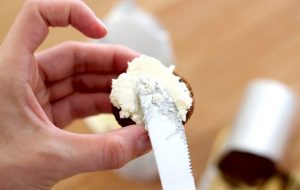 Wir fetten die Kreise mit Quark ein, schneiden den gesalzenen Lachs hinein kleine Stücke.