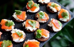 Schöne und leckere Mini-Sandwiches mit Lachs, Quark Wir bereiten zu Hause Käse und Koriander für den festlichen Tisch zu.