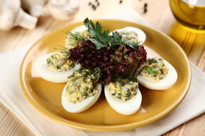 Köstliche angefüllte Fried Chicken Eggs Champignons, Eigelb, Petersilie und Mayonnaise werden zu Hause zubereitet Urlaub. Diese Vorspeise zuzubereiten ist überhaupt nicht schwierig.