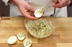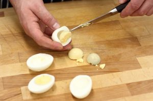 Wir waschen die Eier mit einem Schwamm, kochen für 8-10 Minuten, gießen kaltes Wasser für 5 Minuten und sauber. Schneiden Sie vorbereitet Hühnereier halbieren, Eigelb vorsichtig entfernen und an senden eine Schüssel.