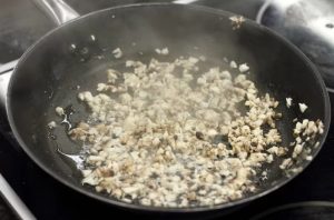 Champignons waschen, fein hacken und in Öl anbraten 10-12 Minuten bis die Flüssigkeit verdunstet ist. Salz und kühl.