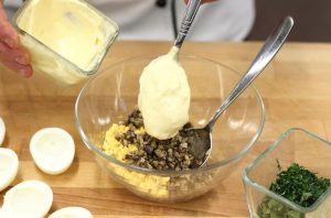 Eigelb mit einer Gabel zerkleinern, die gebratenen Champignons dazugeben, gehackte Petersilie (2 Äste), Mayonnaise und mischen.