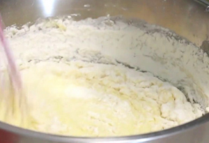 - Gießen Sie Mehl, Backpulver und Rosinen unter ständigem Rühren. Der resultierende Teig sollte so dick wie Sauerrahm sein.