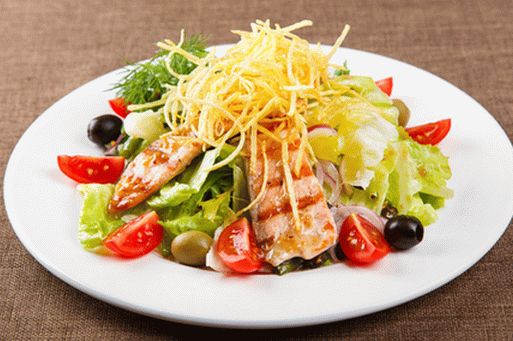 Salat Nicoise – eine brillante Kreation französischer Köche. In Das Originalrezept enthält Thunfisch. Aber wir werden mit Lachs machen. Dann hat dieses Gericht einen reichen Geschmack, und wenn Sie es kochen auf dem Grill – der Effekt ist erstaunlich.