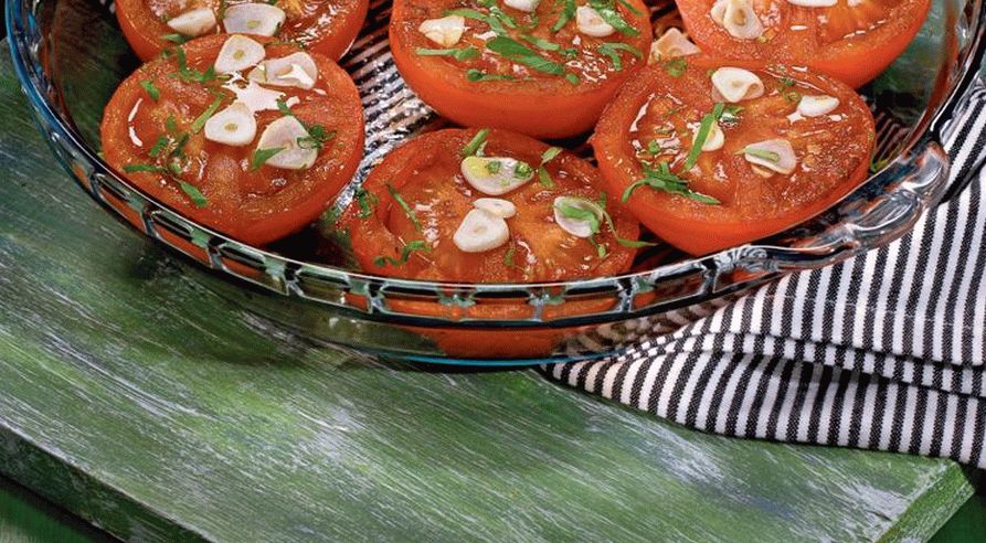 - Den Backofen auf 160 Grad vorheizen. Tomaten in Form bringen zum backen mit zucker und knoblauch bestreuen, mit öl beträufeln und Essig und eine Stunde backen lassen.