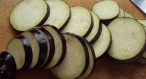 Die Aubergine in Kreise schneiden. Legen Sie sie in eine Schüssel mit hoher die Kanten. Geriebenen Knoblauch, Olivenkräuter und Olivenöl dazugeben. Gut umrühren.