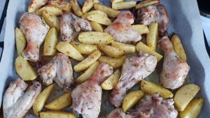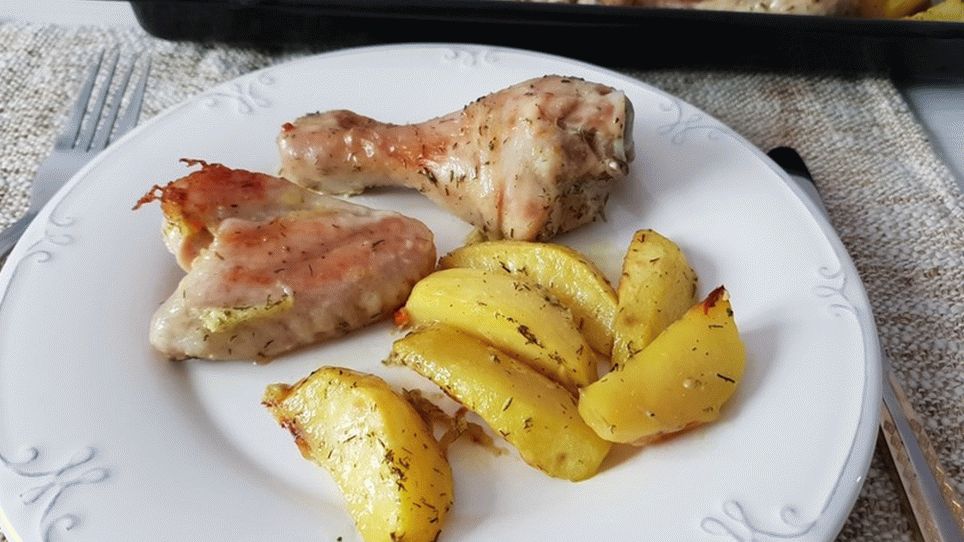 - Kartoffeln schälen und in Scheiben schneiden. Kartoffel, Trommelstöcke und Die Flügel in eine Schüssel geben und mit Butter und Gewürzen mischen. Wir verbreiten es auf Pergament.