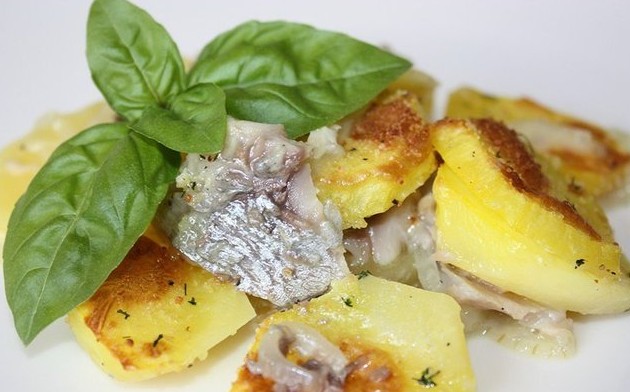 Leckere und herzhafte hausgemachte Auflauf aus Kartoffeln mit Hering. Machen Sie eine klassische Präsentation neuer Produkte!