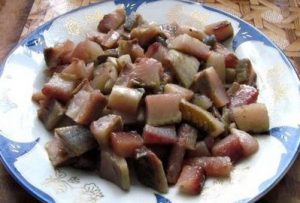 Dann fein gehackte Zwiebeln auf dem Hering Die restlichen Kartoffeln mit Mehl und Wasser bestreuen Öl. - Alles bei schwacher Hitze dünsten, bis es gar ist.