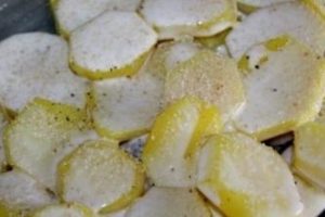 - Wir putzen und waschen das Gemüse. Kartoffeln in Scheiben schneiden und 2/3 davon Eine Schicht Pfeffer und etwas Salz in eine Pfanne geben.