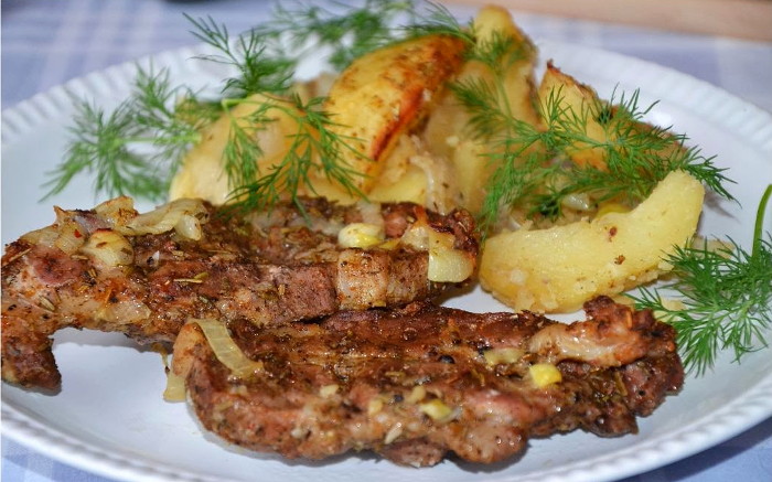 Zartes und leckeres Schweinefleisch – Hals, vorher Eingelegt und ohne Probleme mit Kartoffeln und Zwiebeln überbacken kochen zu hause im ofen. Rosmarin und Gewürze für Schweinefleisch machen Das Gericht ist unglaublich duftend.