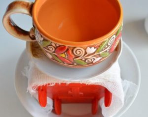 - Die Form mit Gaze bedecken, umdrehen und tief eintauchen eine Schüssel. Wir legen die Masse in einer Form aus, bedecken sie mit Gaze und legen sie darauf untertasse mit fracht. Wir schicken es für sechs bis sieben Stunden in den Kühlschrank.