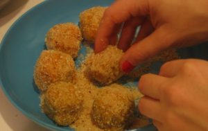 - Bällchen aus Hackfleisch formen und jeweils panieren.