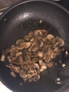 - Knoblauch schälen, fein hacken und in Olivenöl anbraten bei starker Hitze für eine Minute. Spülen, schälen und hacken Champignons. Zum Knoblauch geben und weitere 4 Minuten braten.