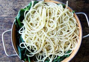 - Nudeln in kochendem Salzwasser verteilen. Mein Spinat und trocken.