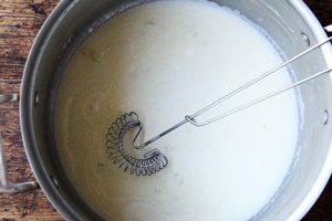 - Die Butter in einer separaten Pfanne oder einem Topf schmelzen lassen. fügen Sie ein Glas Wasser aus Nudeln, Sahne, Wein, Salz und Pfeffer hinzu. Wir wärmen uns auf.