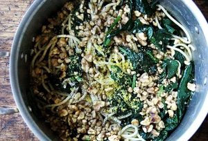 - Die entstandene Sauce zu den Nudeln geben, die Zitronenschale hinzufügen und Nüsse. Mischen und servieren.