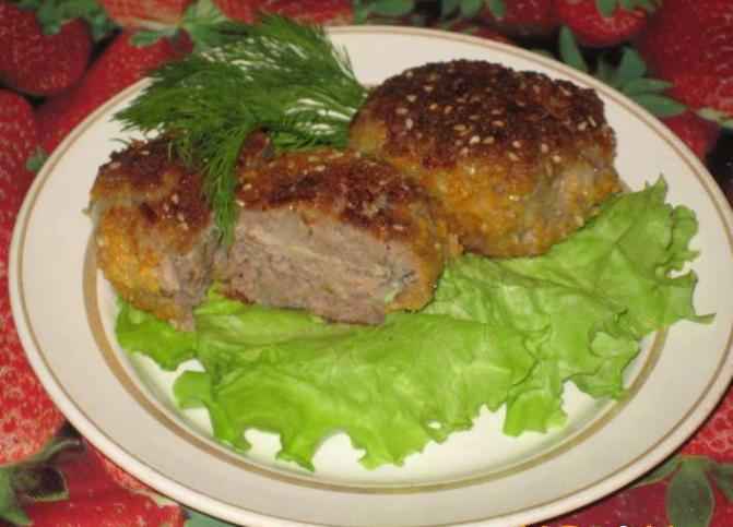 Mode runde Schnitzel aus Hackfleisch, rollen Sie sie in Semmelbrösel mit Sesamsamen. Die Bratlinge in einer gut erhitzten Pfanne anbraten Pflanzenöl. Wenn das Gericht nach dem Braten noch roh ist, ist es Kann im Ofen gekocht werden.