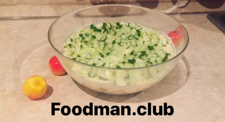 - Dann legen wir unsere Zutaten in eine Salatschüssel im nächsten Reihenfolge: Pflaumen, Mayonnaise, Walnüsse, Mayonnaise, Hühnerbrust, Mayonnaise, Honigpilze, Eier, Mayonnaise, Käse, Mayonnaise, frische Gurke.