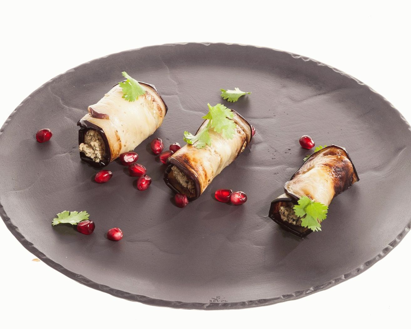 - Setzen Sie die Nussfüllung auf die Auberginenplatte, drehen Sie in rolle. Mit Granatapfelkernen bestreuen.