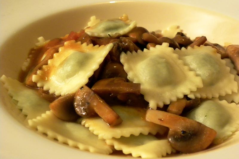 - Ravioli in Salzwasser kochen. Beim Servieren Mit Champignons garnieren.