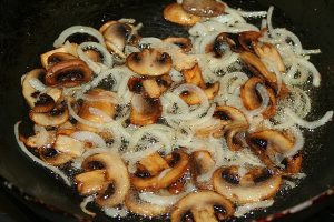 - Pilze hinzufügen. Weitere 5 Minuten braten.