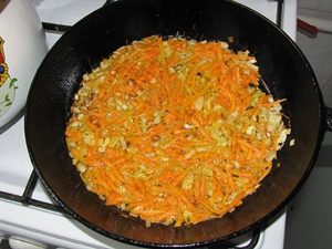 - Zwiebel und Karotten in Streifen schneiden. Gemüse anbraten Pflanzenöl. Champignons dazugeben und weitere 7-10 Minuten braten.