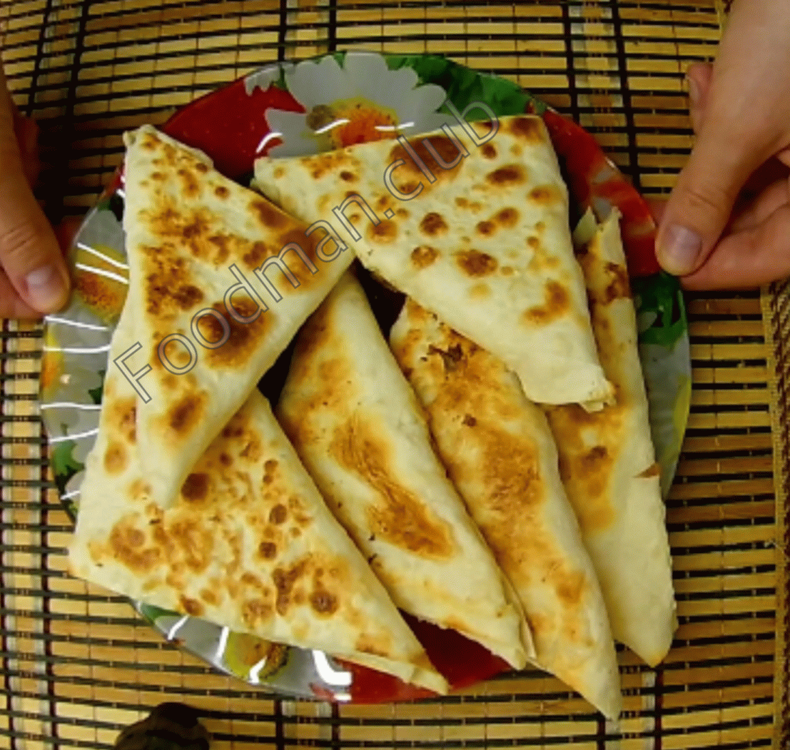 - Käse auf Fladenbrot legen und in dreieckige Umschläge wickeln. Wir schneiden den Überschuss ab.