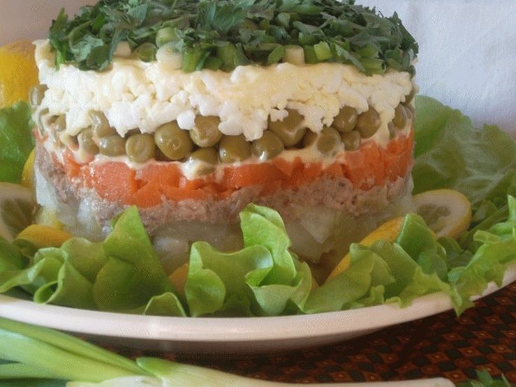 - Wir verteilen Erbsen auf einer gleichmäßigen Schicht Karotten, auf Erbsen – Eiern, mit Mayonnaise einfetten.