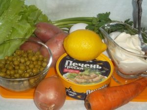 - Wir verteilen die Dorschleber auf der Zwiebel, eine Schicht Karotte auf der Leber. Mit Mayonnaise schmieren.
