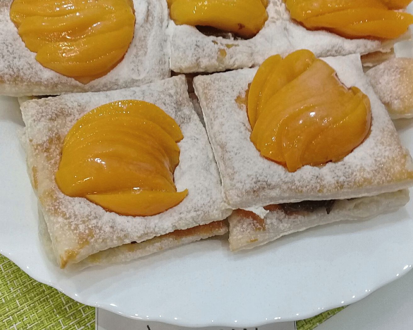 - Zur Versammlung des Hauchs kommen. Ziehen Sie einen Zug ohne Loch an Schoko-Mascarpone und mit einem Hauch mit einem Loch oben bedecken die Mitte. Setzen Sie den gehackten Pfirsich in das Hauchloch. Vorher Servieren Sie die vorbereiteten Puffs mit Puderzucker. Hab ein schönes Appetit.