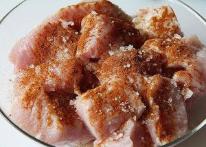 - Den Truthahn ausspülen und in große Würfel schneiden, Gewürze hinzufügen Probieren und einige Minuten einwirken lassen.