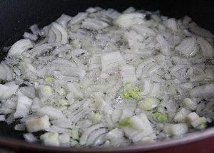 - Die Zwiebel nach Belieben in Würfel / Ringe / Halbringe schneiden und Pflanzenöl einrühren.