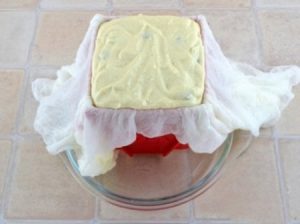 - Wir verteilen die Quarkmasse in Form. Wickeln Sie die Kanten der Gaze und in eine Schüssel geben.