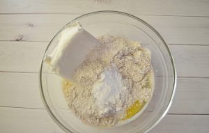 - Milch, Mehl, Quark, Ei, Vanillin und Backpulver mischen.