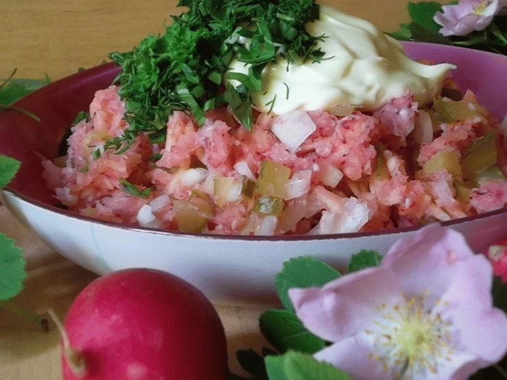 - Den Salat in eine Salatschüssel oder Schüssel geben, Mayonnaise dazugeben und fein gehackte Grüns. Unser Salat mit Apfel und Radieschen ist fertig, können Sie dienen!